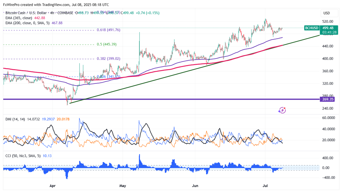 BCHUSD took support near the 55 4H EMA and showed a minor pullback. It hit a low of $469 and is currently trading around $499. Overall trend is bullish as long as the support $440 holds.