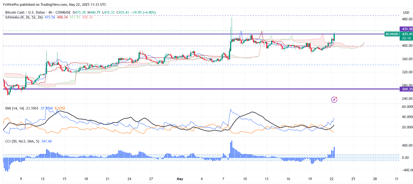BCHUSD breaks significant resistance $435 and started to catch Bitcoin.It hits a high of $440.79 and is currently trading around $435.42. Overall trend is bullish as long as support $379 holds.