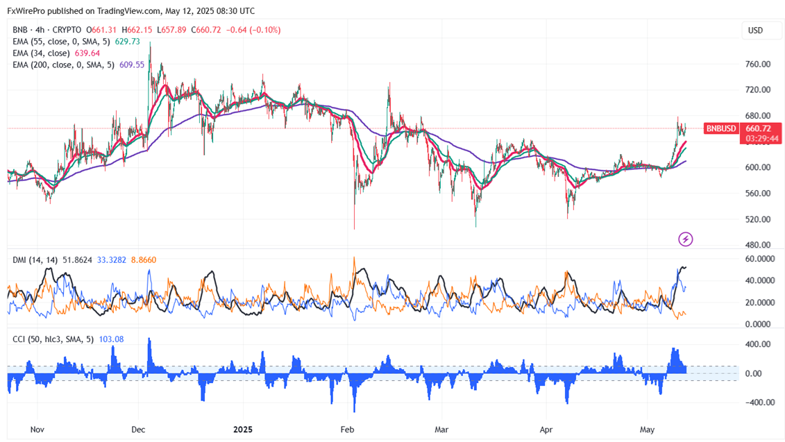 Overall bias remains bullish as long as support $500 holds. It trades above the 34 and 55 EMA on the 4-hour chart. Near-term support is around $640 , any breach below targets $600/$570/$520. If the pair closes below $500, potentially leading to further declines towards $400.
