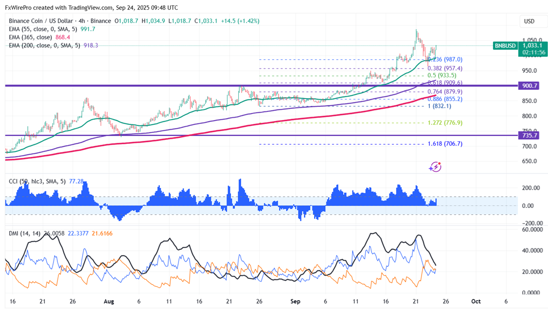 Short-term trend remains bullish as long as support $867 (365 4H EMA) holds. It trades above the 55,200 and 365 EMA on the 4-hour chart. Near-term support is around $989; any close below targets $960/$940/$928/$900/$865/$845/$810/$780/$755/$740. If the pair closes below $500, it potentially leads to further declines towards $400.