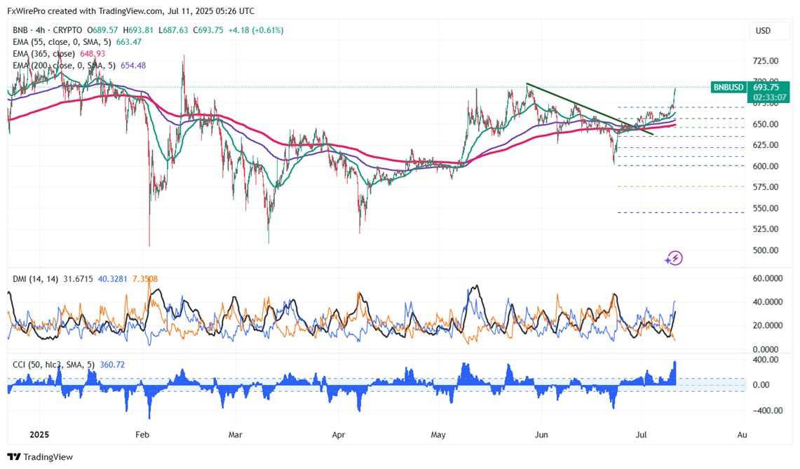 BNB/USD surges sharply as Bitcoin reaches a new all-time high. It hits an intraday high of $691.40 and is currently trading around $690.46.