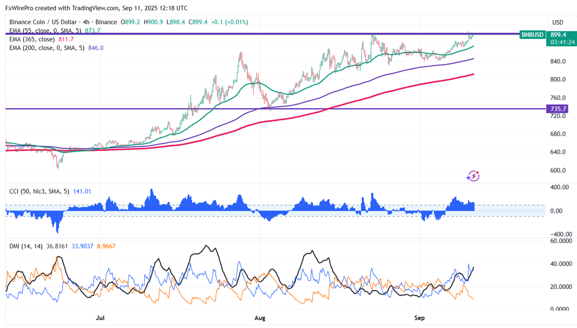 BNBUSD hits a fresh all-time high on positive developments. It hit a high of $907.40 and is currently trading around $899.40.