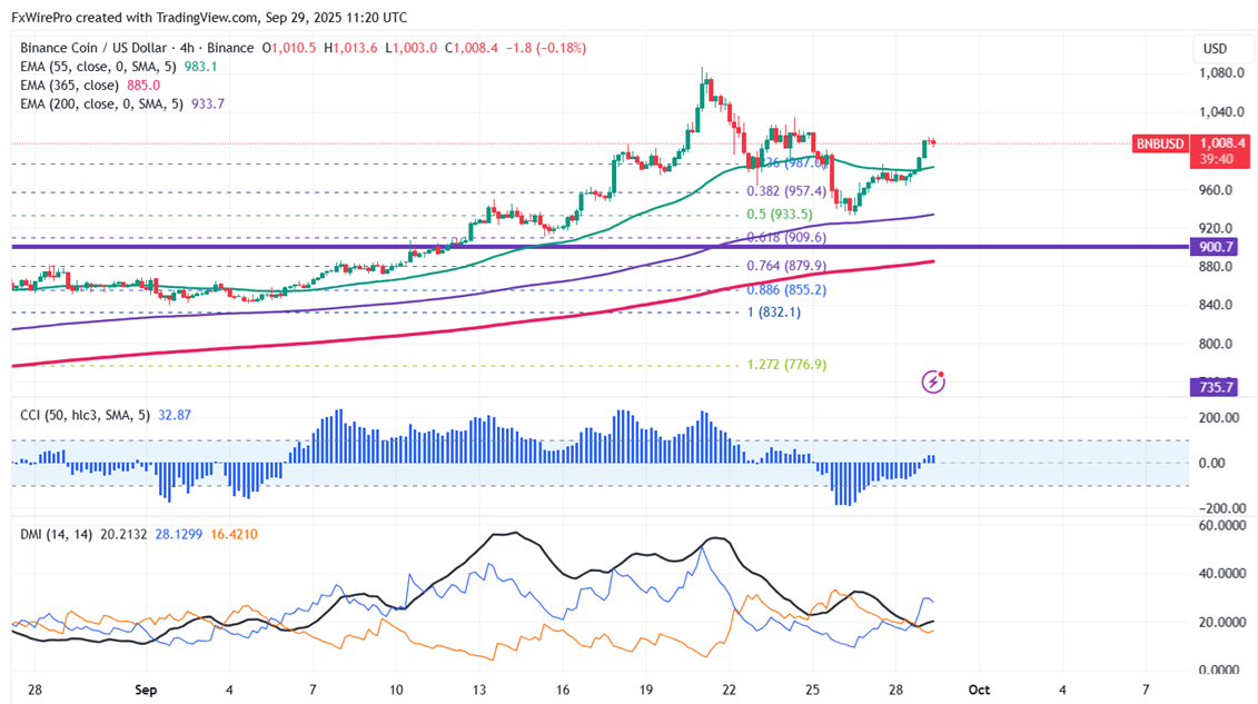 Short-term trend remains bullish as long as support $872 (365 4H EMA) holds. It trades above the 55,200 and 365 EMA on the 4-hour chart. Near-term support is around $985; any close below targets $960/$928/$900/$865/$845/$810/$780/$755/$740. If the pair closes below $500, it potentially leads to further declines towards $400.