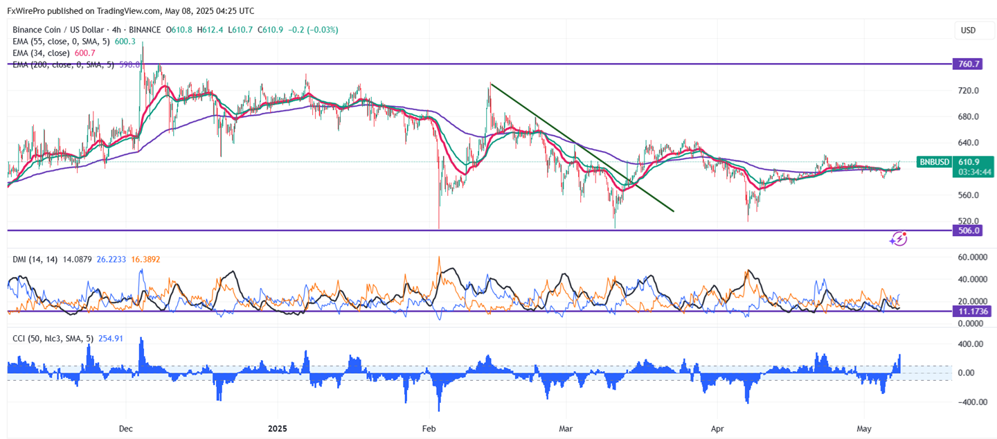 BNB/USD gained slightly after forming a minor bottom around $584.40. It hit a high of $612.40 at the time of writing and is currently trading around $610.80.