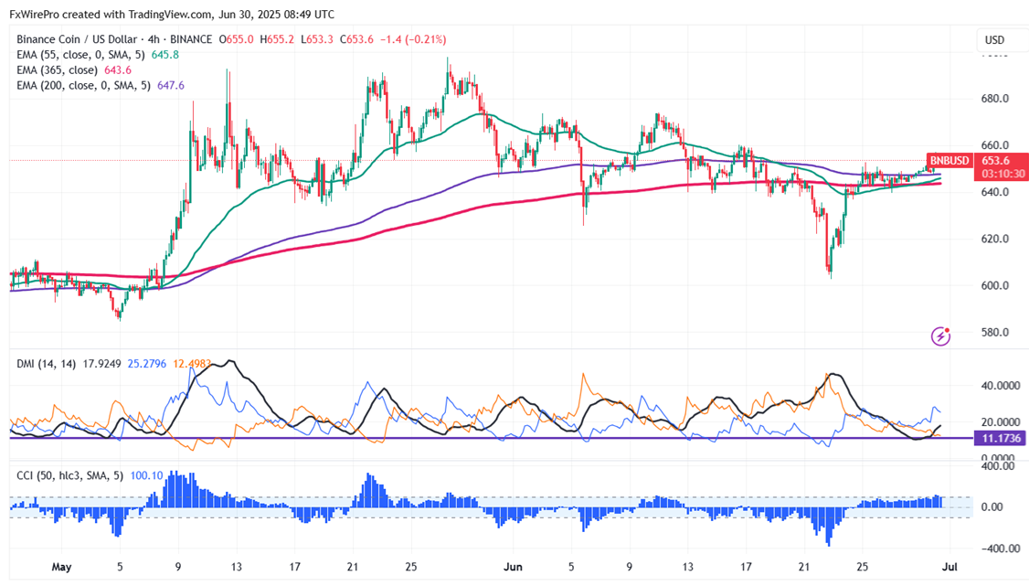 BNB/USD trades higher and surged more than $50 in the past week. It hits an intraday high of $657 and is currently trading around $653.60.