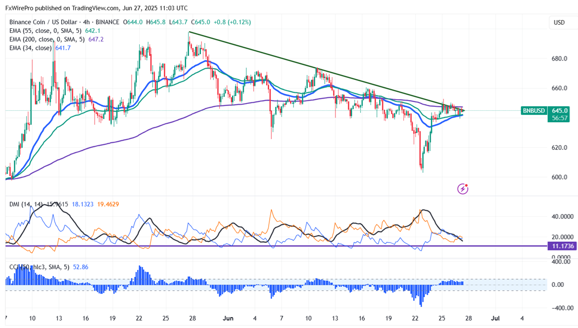 BNB/USD consolidates in a narrow range after a minor pullback. It hits an intraday high of $647 and is currently trading around $645.10.