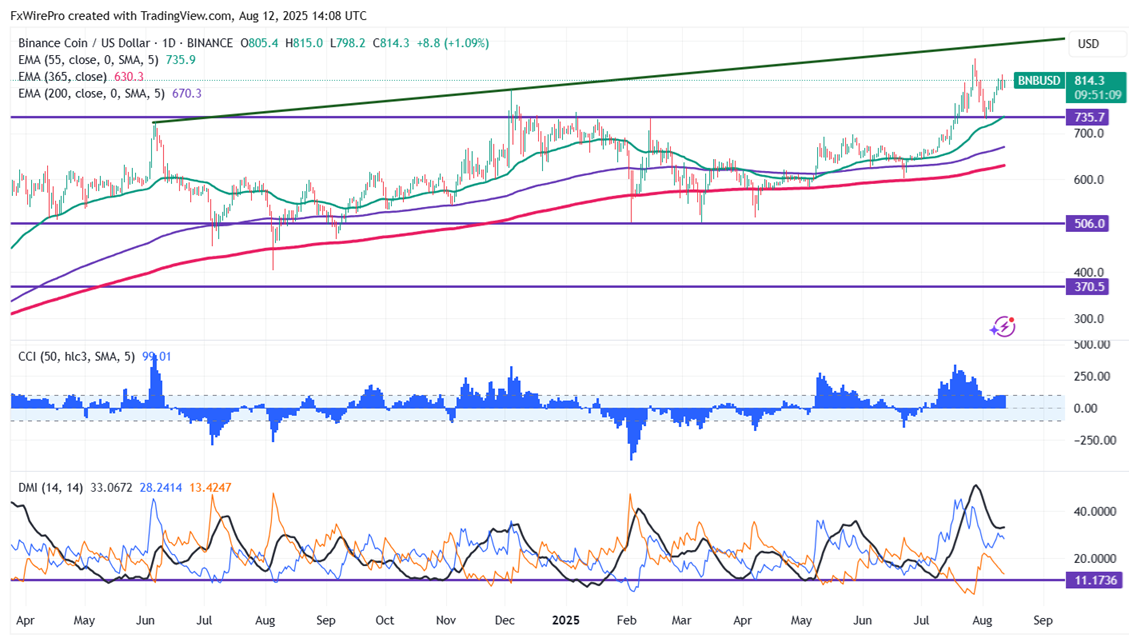 BNB/USD pared some of its gains due to profit booking. It hits an intraday low of $798 and is currently trading around $801.70.