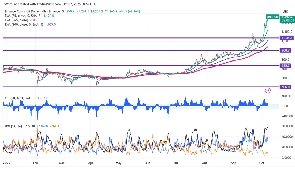 Following in the footsteps of Bitcoin, BNBUSD reaches a new all-time high. It is now trading at about $1245.60, having reached a new record of $1263.60.
