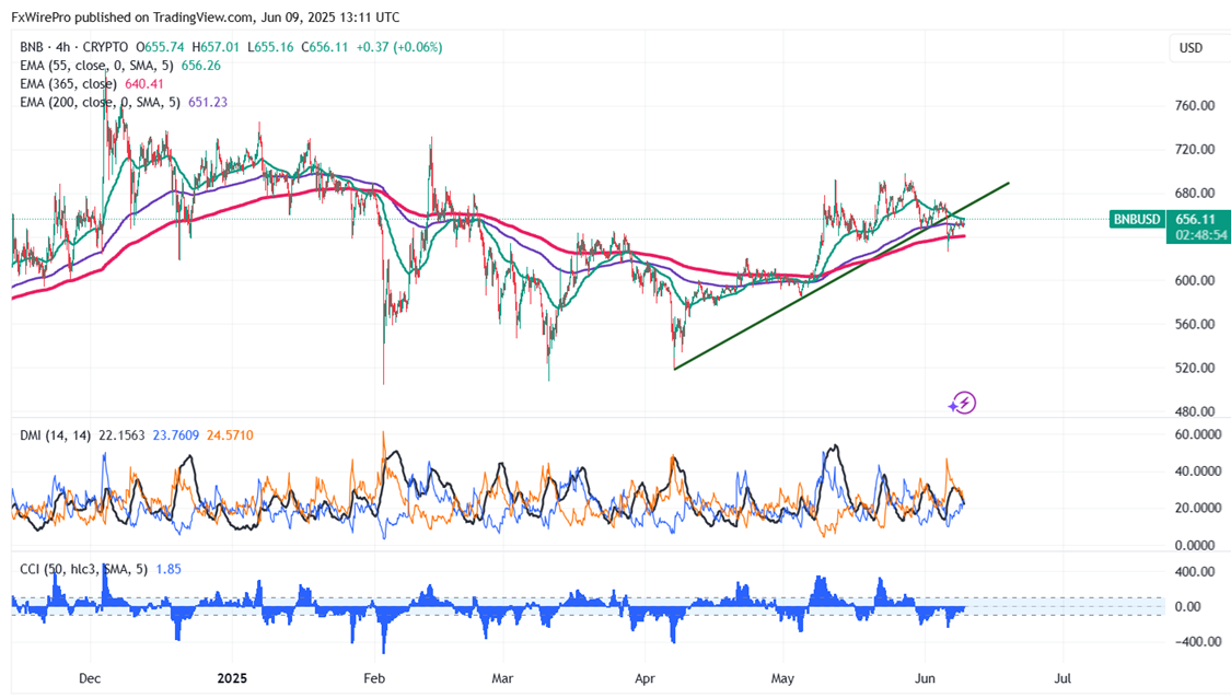 BNB/USD recovered sharply following the footsteps of Bitcoin. It hit an intraday high of $657 and is currently trading around $656.70.