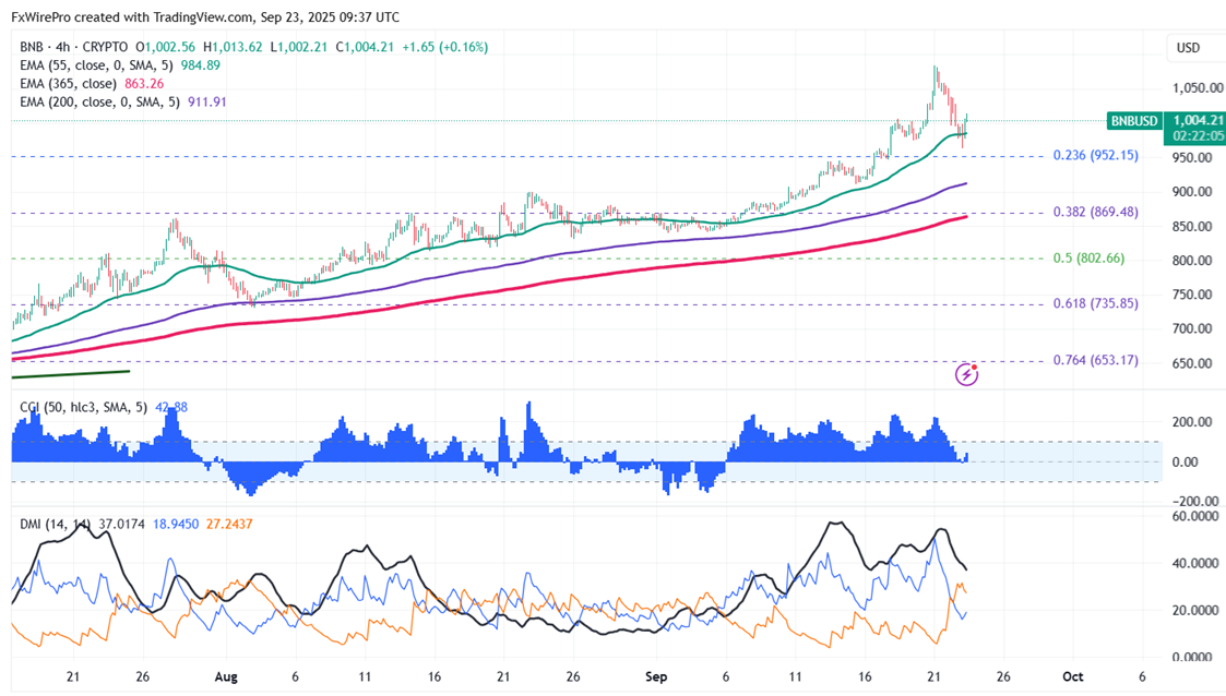 BNBUSD trades above $1000 after taking support near 38.2% fib. It hits an intraday low of $963 and is currently trading around $991.30.