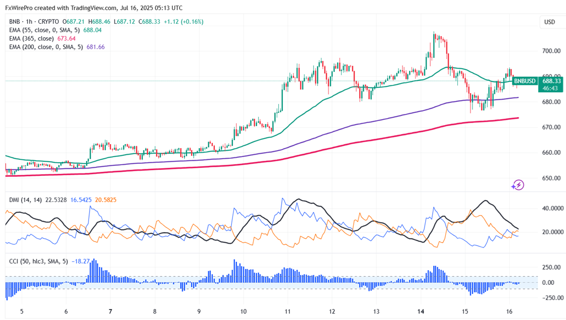 BNB/USD took support near 365 H EMA and showed a minor pullback. It hits an intraday high of $693 and is currently trading around $687.89.