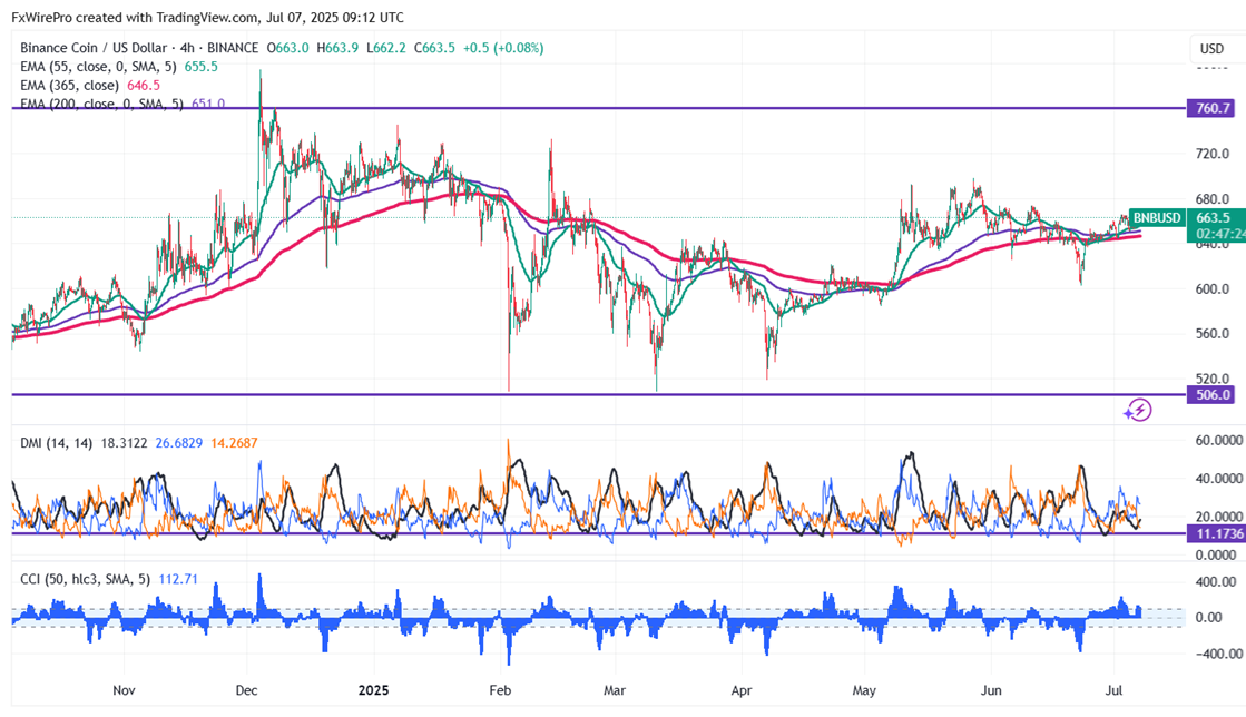 BNB/USD has been consolidating in a narrow range between $666.30 and $650.70 in the past four days. It hits an intraday high of $666.30 and is currently trading around $663.50.