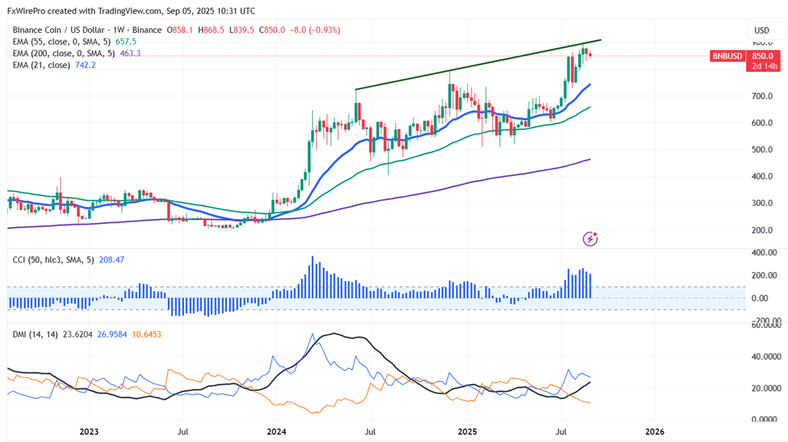 Short-term trend remains bullish as long as support $742 (21 W EMA) holds. It trades above the 55,200 and 365 EMA on the weekly chart. Near-term support is around $830; any close below targets $800/$780/$755/$740/$700/$670/$650/$644/$628/$598. If the pair closes below $500, it potentially leads to further declines towards $400.
