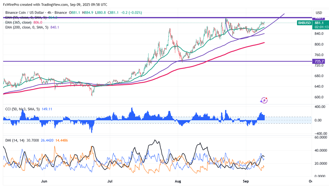 Short-term trend remains bullish as long as support $805 (365 4H EMA) holds. It trades above the 55,200 and 365 EMA on the 4-hour chart. Near-term support is around $860; any close below targets $830/$800/$780/$755/$740/$700/$670/$650/$644/$628/$598. If the pair closes below $500, it potentially leads to further declines towards $400.