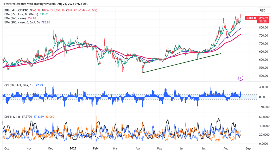 Short-term trend remains bullish as long as support $755 (365-4H EMA) holds. It trades above the 55,200 and 365 EMA on the 4-hour chart. Near-term support is around $800; any close below targets $780/$755/$730/$700/$670/$650/$644/$628/$598. If the pair closes below $500, it potentially leads to further declines towards $400.