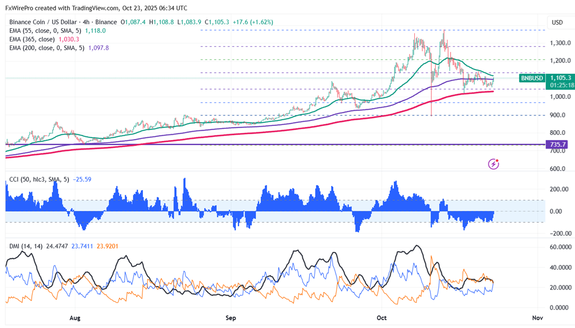 BNBUSD trades in a narrow range between $1053 and $1143 for the past three days. It hits an intraday high of $1108.80 and is currently trading around $1107.