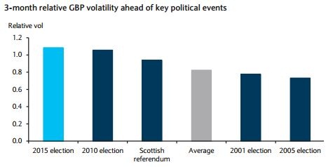 However relative volatility is well above and stands at 0.4% point above average. Market is expecting this event to be more volatile than previous elections and even Scottish Referendum. Chart courtesy FT.
