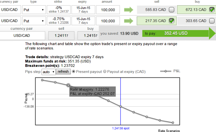 Bear Put Spread = Long on ATM Put (strike at 1.2413) + Short another Put with lower Strike Price (Out of the Money at 1.2320).