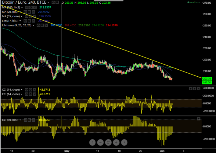 We prefer to Buy BTC/EUR around 210 for the target of 195 with stop around 217.