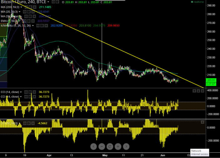 We prefer to Sell BTC/EUR around 210 for the target of 195 with stop around 218.