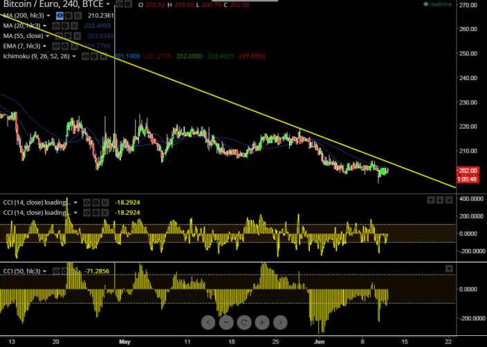 We prefer to Sell BTC/EUR around 205 for the target of 195 with stop around 211.