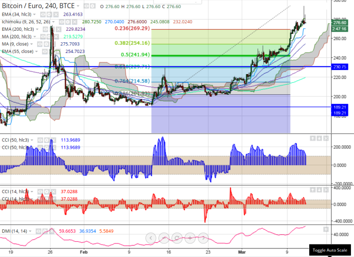 - BTC/EUR has retreated till 276 after making a high of 293.75. Overall trend is bearish as long as short term resistance 300 holds.