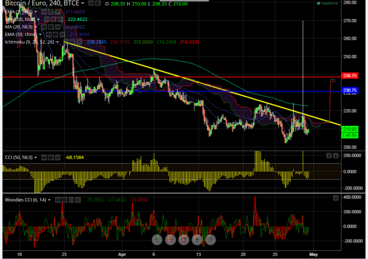 We prefer to Sell BTC/EUR around 217 SL 225, Targets 208/200.