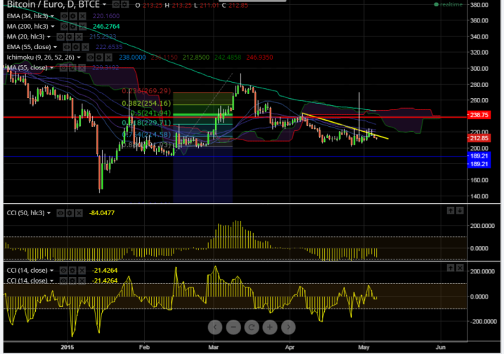 - BTC/EUR is struggling to close above 221 (200 day 4HMA) and any trend reversal can happen only above that level.