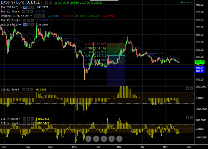 We prefer to sell BTC/EUR around 212 for the target of 200 with stop around 219.