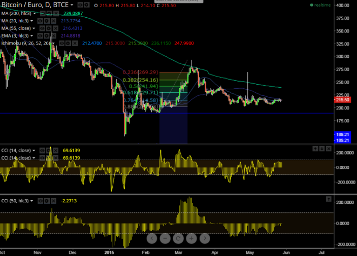 - BTC/EUR is struggling to close above 217 (55 day EMA) and any trend reversal can happen only above that level.