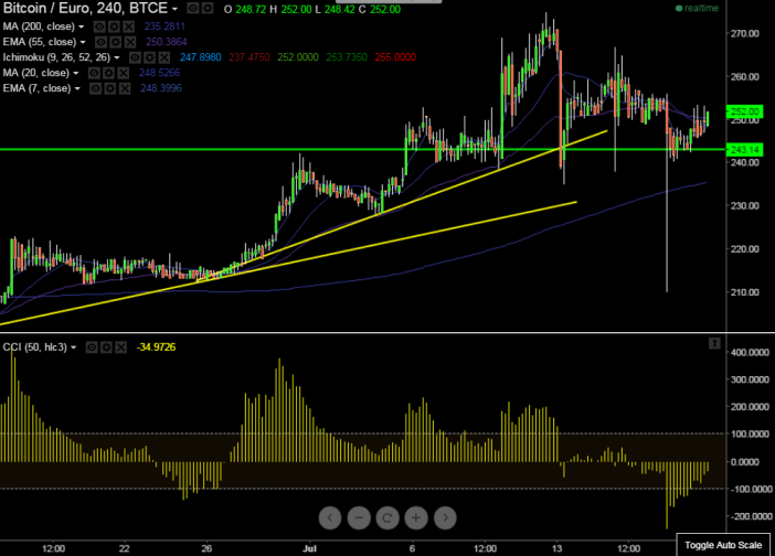 We prefer to Sell BTC/EUR around 260 SL 270, Targets 235/225.
