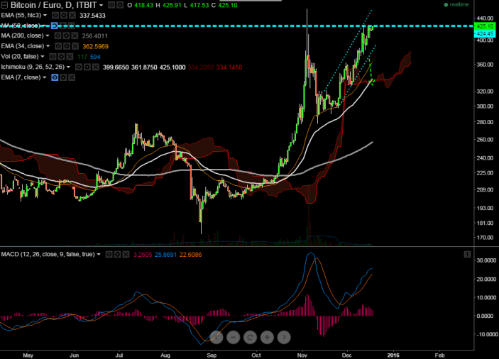 - BTC/EUR has broken major resistance 425 and this confirms minor bullishness, a jump till 455/510 cannot be ruled out