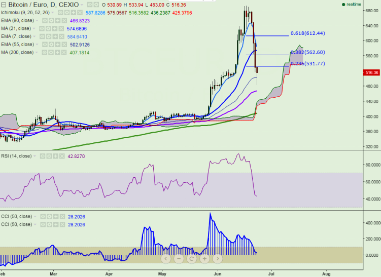 BTC/EUR trades in red on Thursday and further plunge is expected. The pair has broken major psychological support at 500 and declined till 483 levels (CEXIO). It is currently trading at 518.52 at the time of writing.