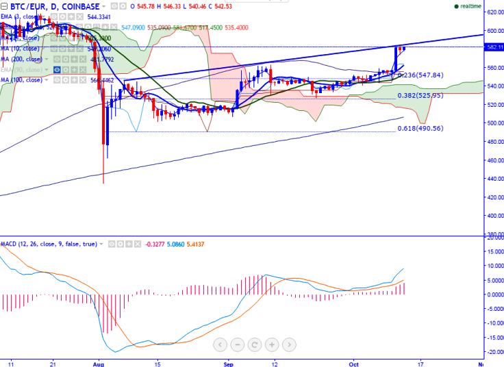 BTC/EUR is seen trading slightly above on Thursday. The pair has slightly declined after making a high of 584.06 yesterday (COINBASE). It is currently trading around 581.77 at the time of writing.