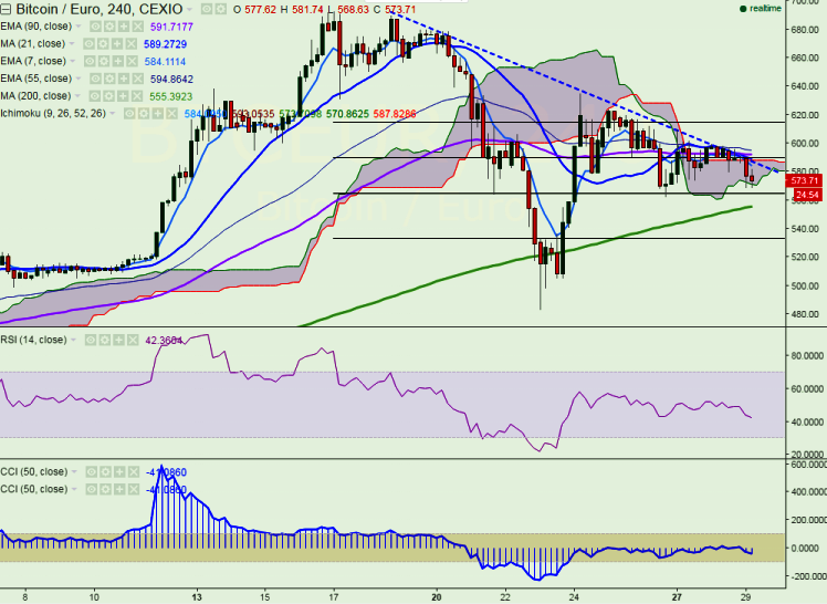 BTC/EUR is seen trading in the red on Wednesday. The pair has declined slightly after making a high of 610 levels (CEXIO). It is currently trading at 578.47 at the time of writing.
