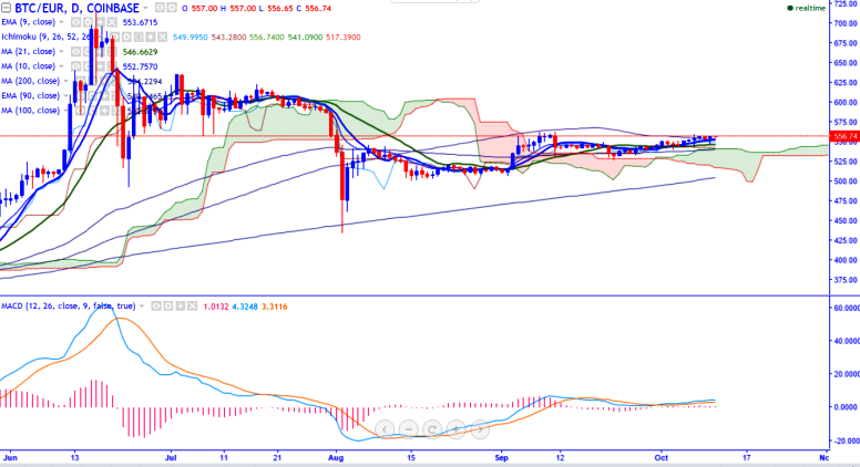 BTC/EUR is seen trading slightly above on Tuesday. The pair has recovered sharply from the low of 546.78 made yesterday (COINBASE). It is currently trading around 557.48 at the time of writing.