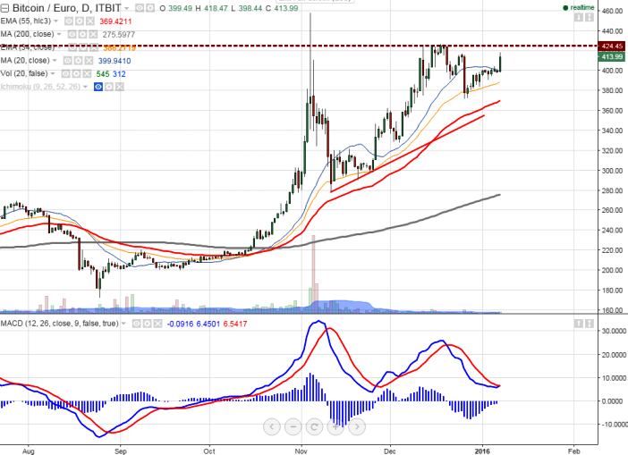 - BTC/EUR has broken minor resistance 400 and jumped till 418. It is currently trading around 413.