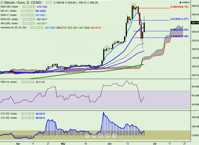 BTC/EUR is seen trading above in green on Friday. The pair has recovered after making a low of 493 levels (CEXIO) yesterday. It is currently trading at 610 at the time of writing.