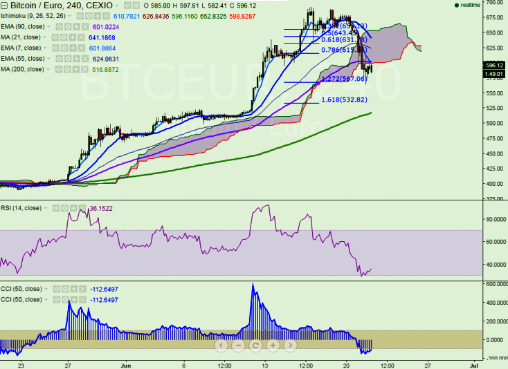 BTC/EUR is seen trading below 600 on Wednesday. The pair has slightly recovered after making a low of 563.93 and declined till 606.86 levels (CEXIO). It is currently trading at 596 at the time of writing.