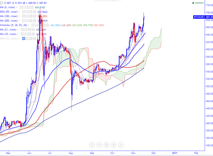 BTC/EUR is seen trading slightly below on Thursday after the raise. The pair breaks major resistance 675 and jumped till 699.74 yesterday (COINBASE). It is currently trading around 683.67 at the time of writing.
