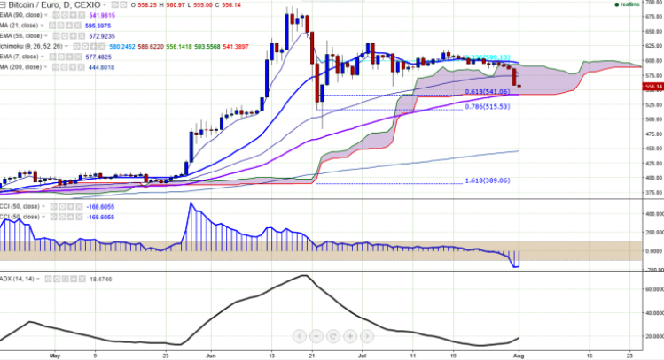 BTC/EUR is seen trading well below in red on Monday. The pair has broken minor support at 580 and declined till 555 levels (CEXIO). It is currently trading at 557.11 at the time of writing.
