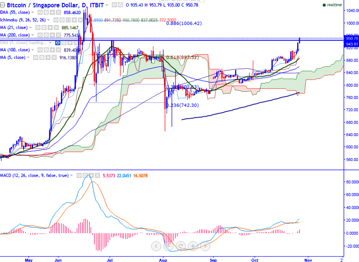 BTC/SGD is seen trading well above on Thursday. The pair has broken the major resistance 945 (Jul 2nd high) and jumped till 949.97 levels (ITBIT). It is currently trading around 950.78 at the time of writing.
