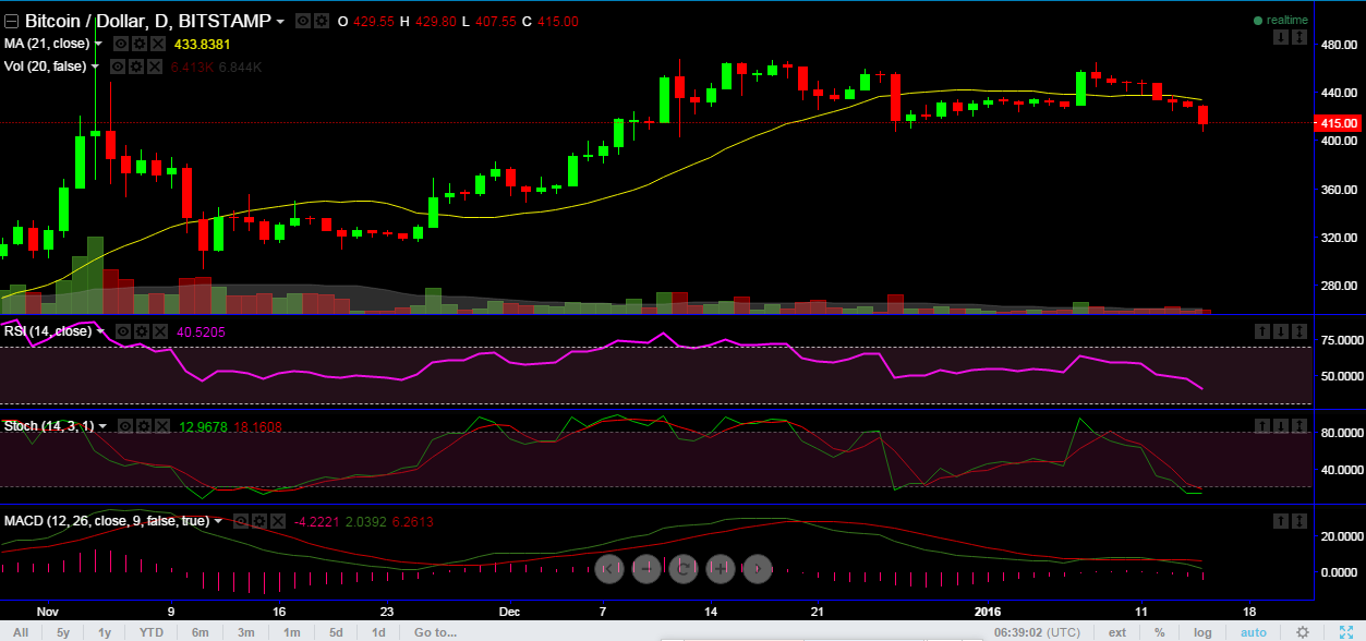 BTC/USD continues trading in the red on Friday and currently trades round 416.00 levels at the time of writing. The pair touched a high (and major resistance) at 465 levels last week, and failed to break above.