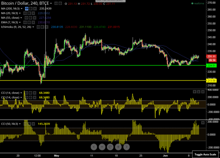 - BTC/USD is consolidating between $230 and $222 for the past five trading session. Overall trend is bullish as long as support $225 holds.