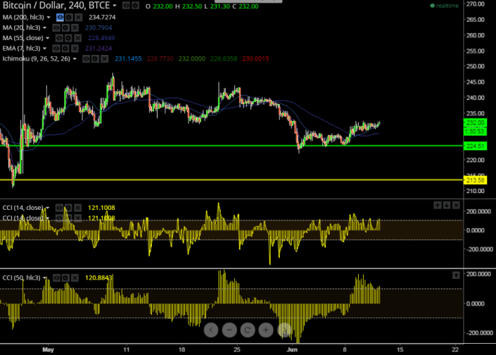 - BTC/USD is consolidating between $230 and $222 for the past five trading session. Overall trend is bullish as long as support $225 holds.
