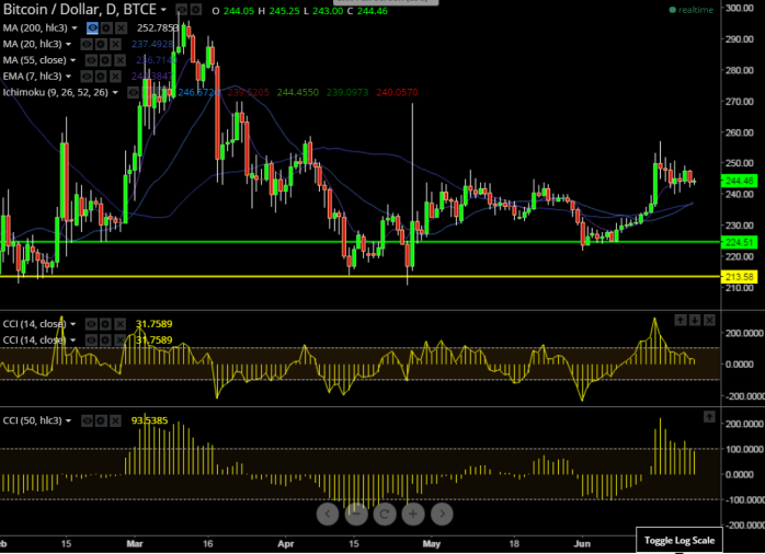 - BTC/USD has made a high $257 and retreats from that level. Overall trend is bullish as long as support $ 234 holds