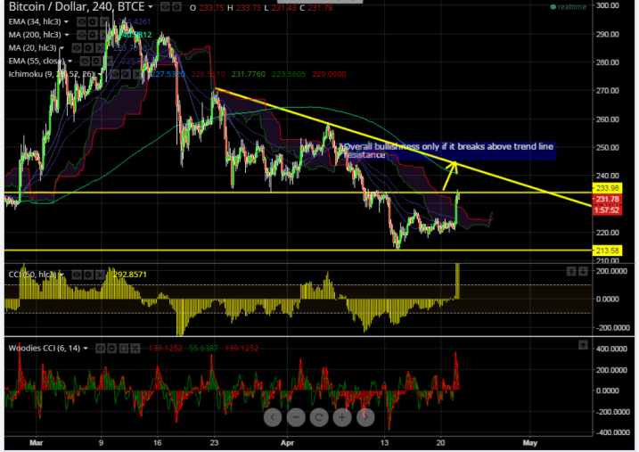 - BTC/USD has broken the minor resistance $228 and this confirms short term trend reversal a jump till $244 (trend line joining $269.90 and $258.80) cannot be ruled out.