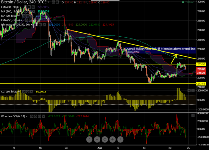 - BTC/USD is consolidating around $235 and $230 for the past two trading session. Overall trend is neutral and any trend reversal can happen only above $244 (trend line joining $269.90 and $258.80.
