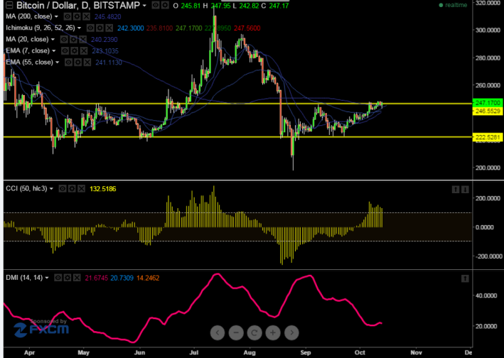 - BTC/USD has broken major resistance $245 (200 day 4 HMA) and this confirms short term bullishness, a jump till $258/$272 is possible It is currently trading at $248. Short term trend is bullish as long as support $235 holds