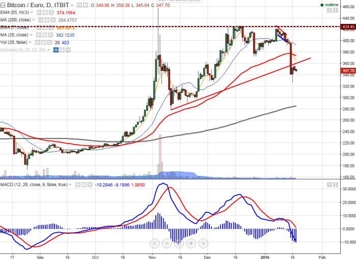 - BTC/EUR has broken major support 370 and declined till 326. It is currently trading around 347.